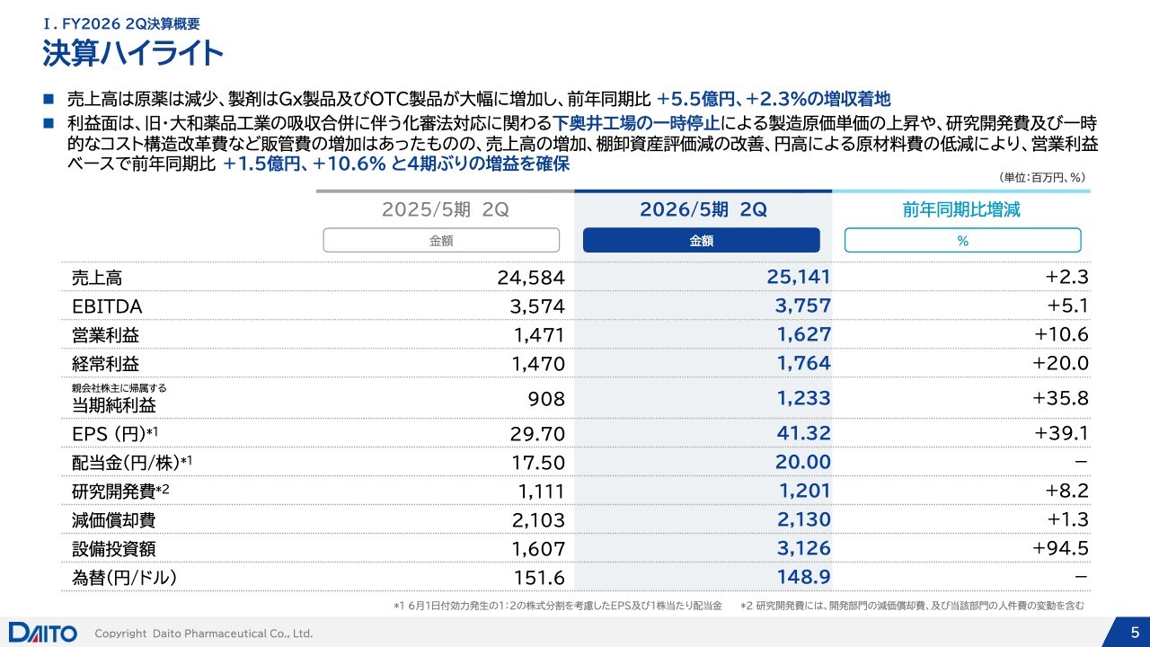 決算のハイライトです。売上高については原薬部門で予算を超過しましたが、前年同期比では若干減収となりました。しかし、製剤部門でこれを補い、全体としては増収で着地しました。