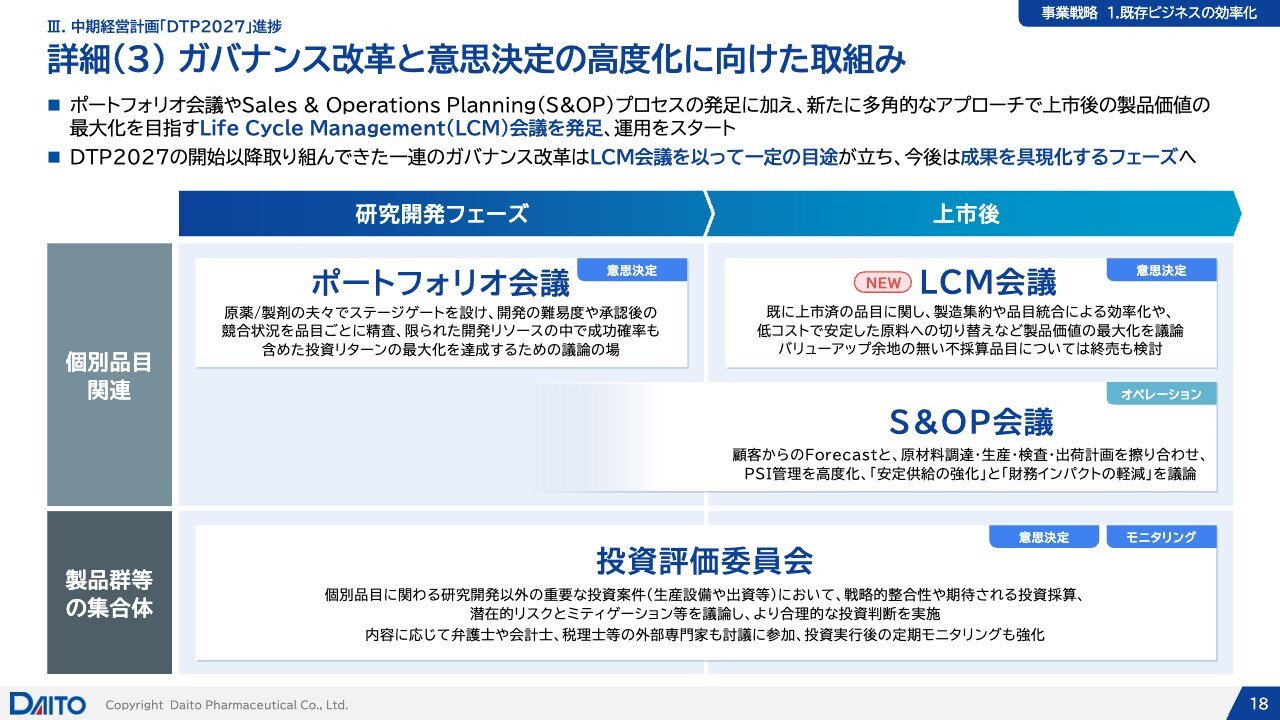 既存ビジネスの効率化として一生懸命取り組んできた、ガバナンス改革についてです。製品に関しては、上流の開発品目に関する「ポートフォリオ会議」や、先ほどCFOがご説明した「S&OP会議」が現在、しっかりと機能し始めています。