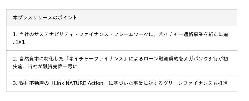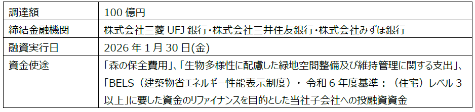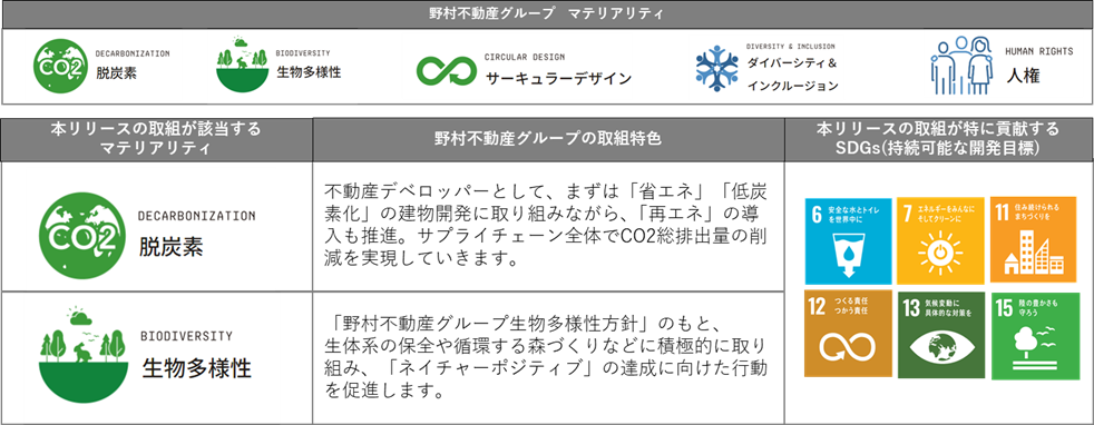 野村不動産ホールディングス株式会社(本社:東京都港区/代表取締役社長:新井 聡、以下「当社」) は、株式会社三菱UFJ 銀行(本社:東京都千代田区/代表取締役頭取:半沢 淳一)・株式会社三井住友銀行(本社:東京都千代田区/頭取 CEO:福留 朗裕)・株式会社みずほ銀行(本社:東京都千代田区/代表取締役頭取:加藤 勝彦)と、国際資本市場協会(以下「ICMA」)が策定した「グリーンボンドガイド(2025)」(以下「グリーンボンドガイド」)およびネイチャーボンドガイドに基づく「ネイチャーファイナンスおよびグリーンファイナンス」について3 行合計で100 億円の融資契約(以下「本取り組み」)を締結いたしました。なお「ネイチャーファイナンス」によるローン融資契約は3 行にとって初の取り組みであり、当社が融資先の第一号となります。