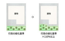 各行政で定められた緑化基準×110%以上の緑化計画とします。また、建築前後における緑量、開発物件全体の緑量を建築前後で比較します※5。