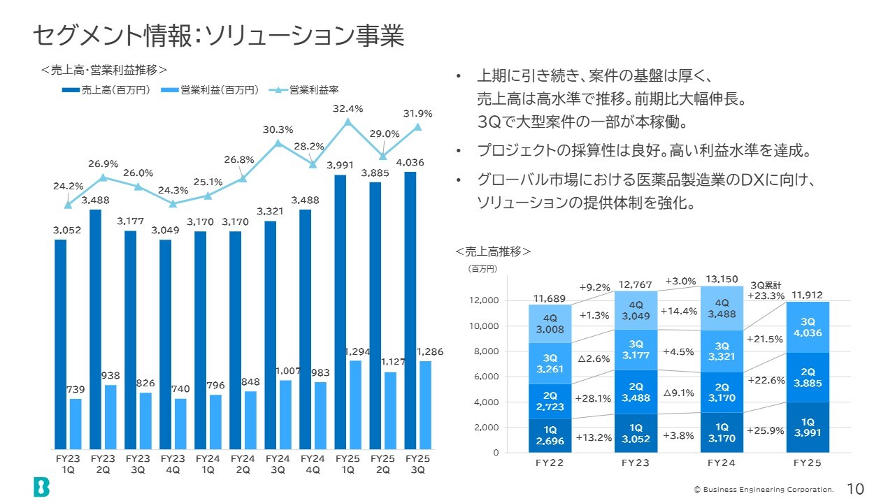 また、営業利益では、ソリューション事業の第3四半期累計が前期比40パーセント弱の高い増益を達成しました。プロダクト事業は、第3四半期が前期比47パーセント増、累計で前期比24パーセント増と、こちらも高い増益を実現しています。