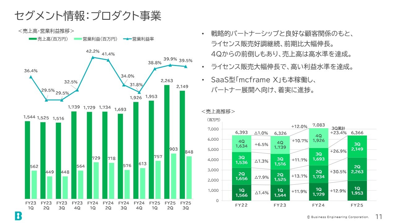 プロダクト事業では、第2四半期および第3四半期において高水準の売上高を達成しました。また、利益率はおおむね40パーセントを安定的に維持しています。第3四半期の売上高については、第4四半期からの前倒しもあり、高水準を達成しました。