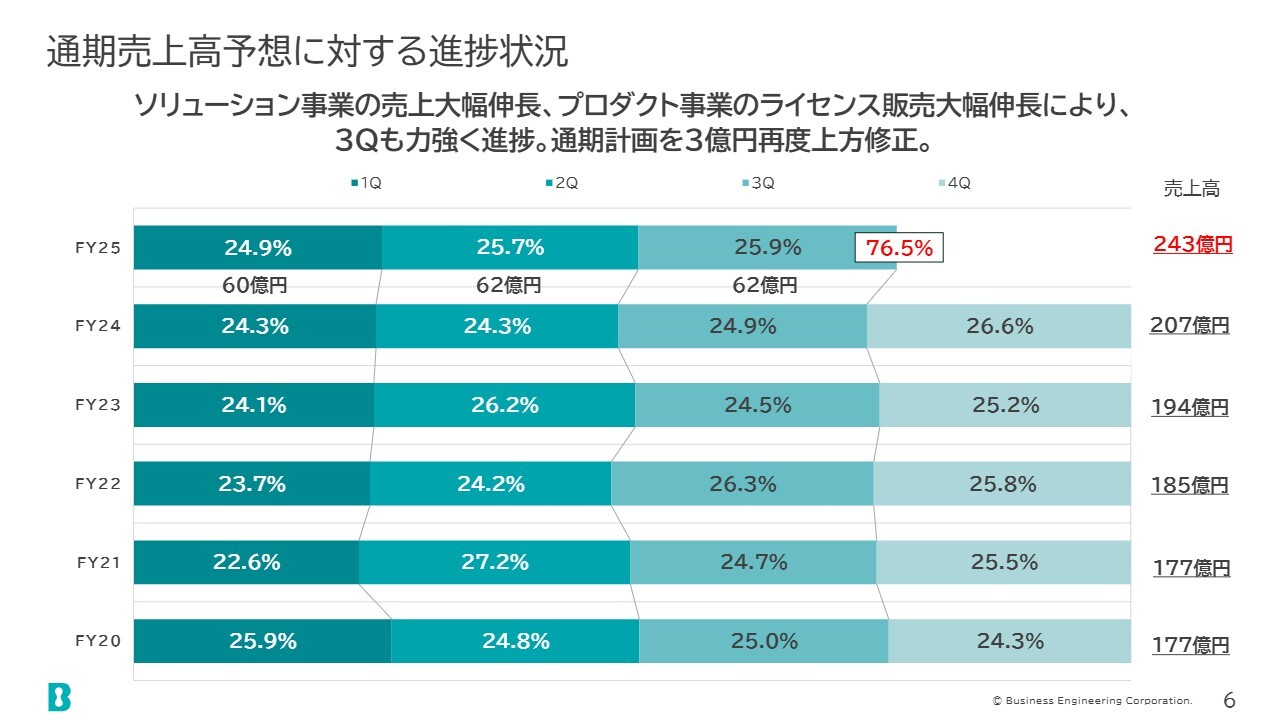 通期売上高予想に対する進捗状況です。3億円上方修正した243億円に対して、進捗率は76.5パーセントです。