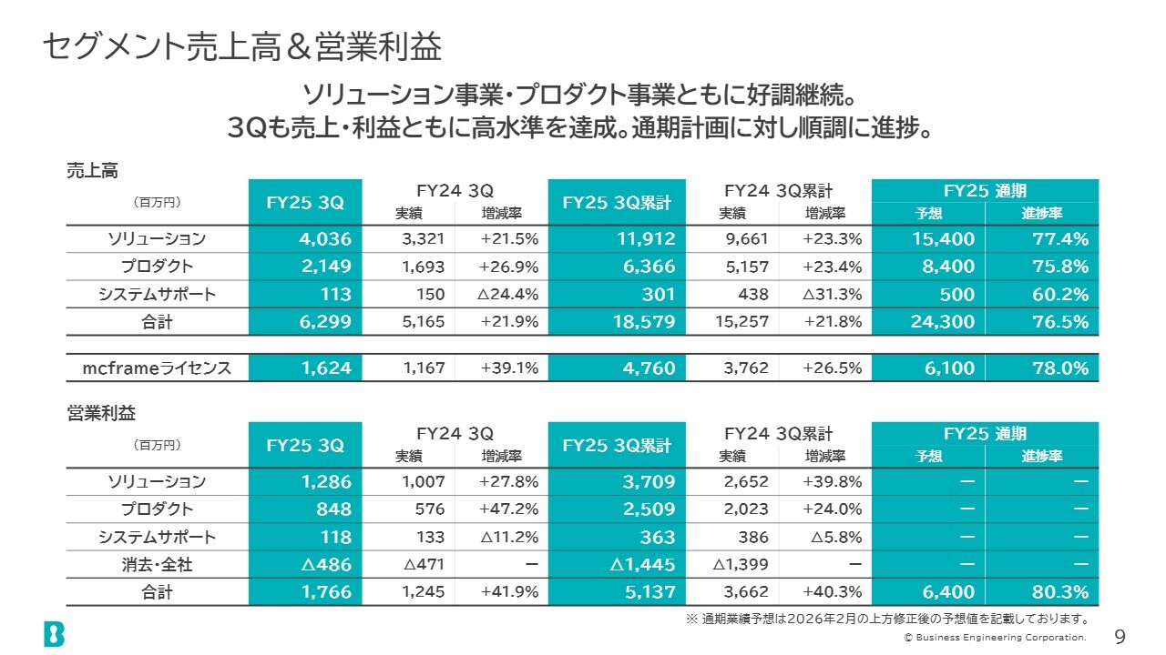 セグメントごとの売上高と営業利益です。ソリューション事業とプロダクト事業のいずれも、第3四半期および第3四半期累計で高い増加率を記録しました。
