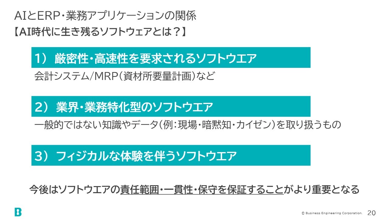 私たちが取り扱うERP・業務アプリケーションについては、AI技術を取り込んで活用し、AIとともに共存して進化していくものと考えています。その理由として、スライドに示している3点を挙げています。