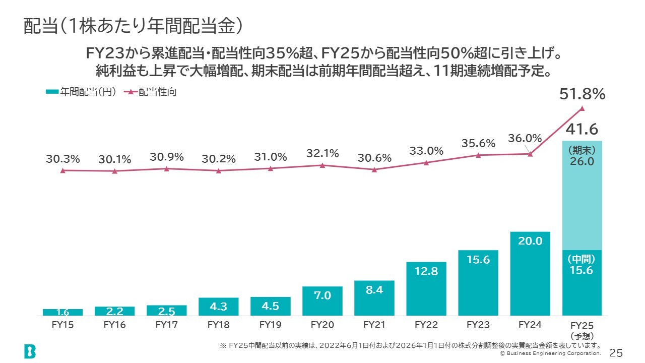 本年度の年間配当は、前回予想から4円増額し41.6円とし、配当性向は51.8パーセントを予定しています。昨年の20円に対して倍以上となる額を予定しています。さらに、11期連続増配となります。
