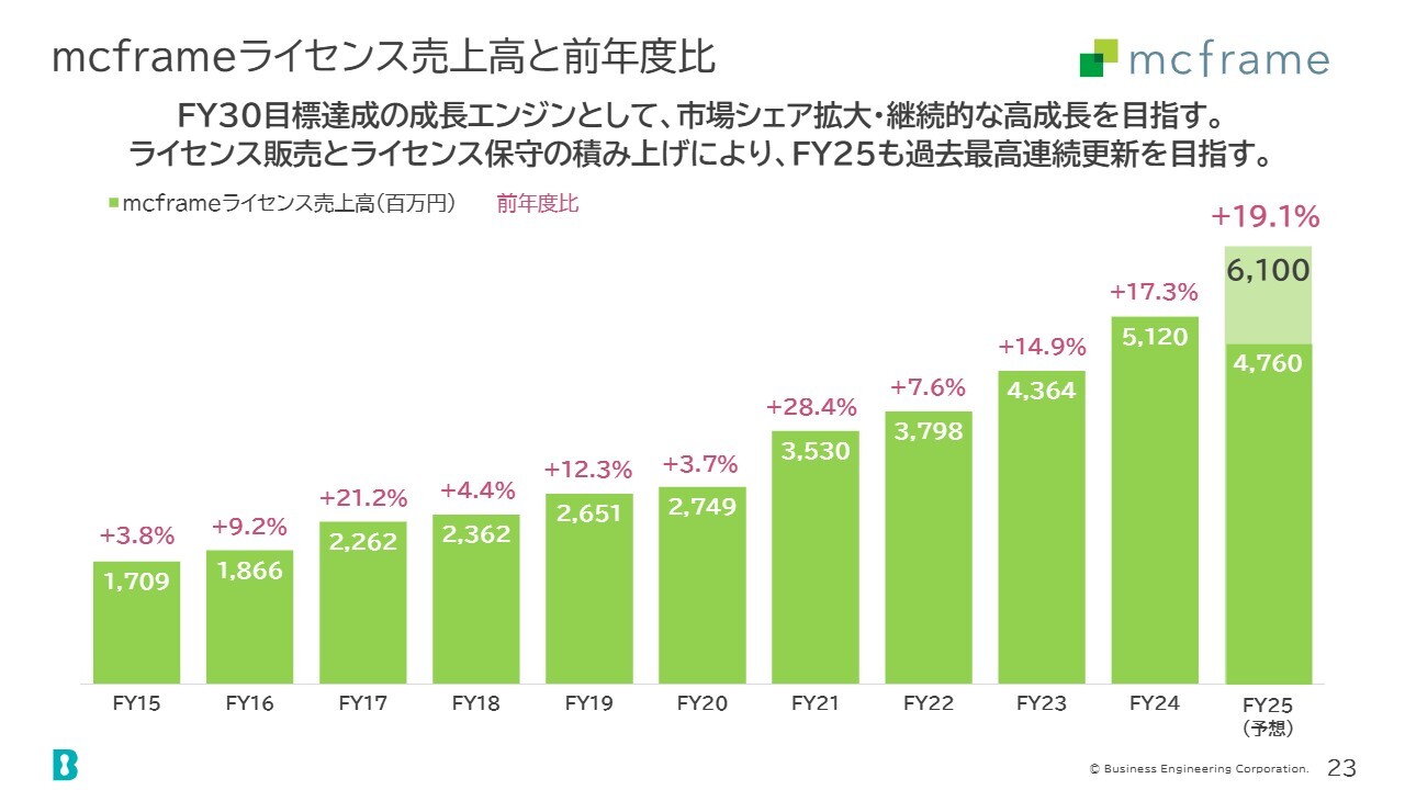 「mcframe」ライセンス売上高は、前回予想から1億円増加し、61億円を見込んでいます。前年度比で19.1パーセントの増加となり、前年度の成長率17.3パーセントを上回る成長を示しました。今年度も過去最高売上高の連続更新を目指して進めていきます。