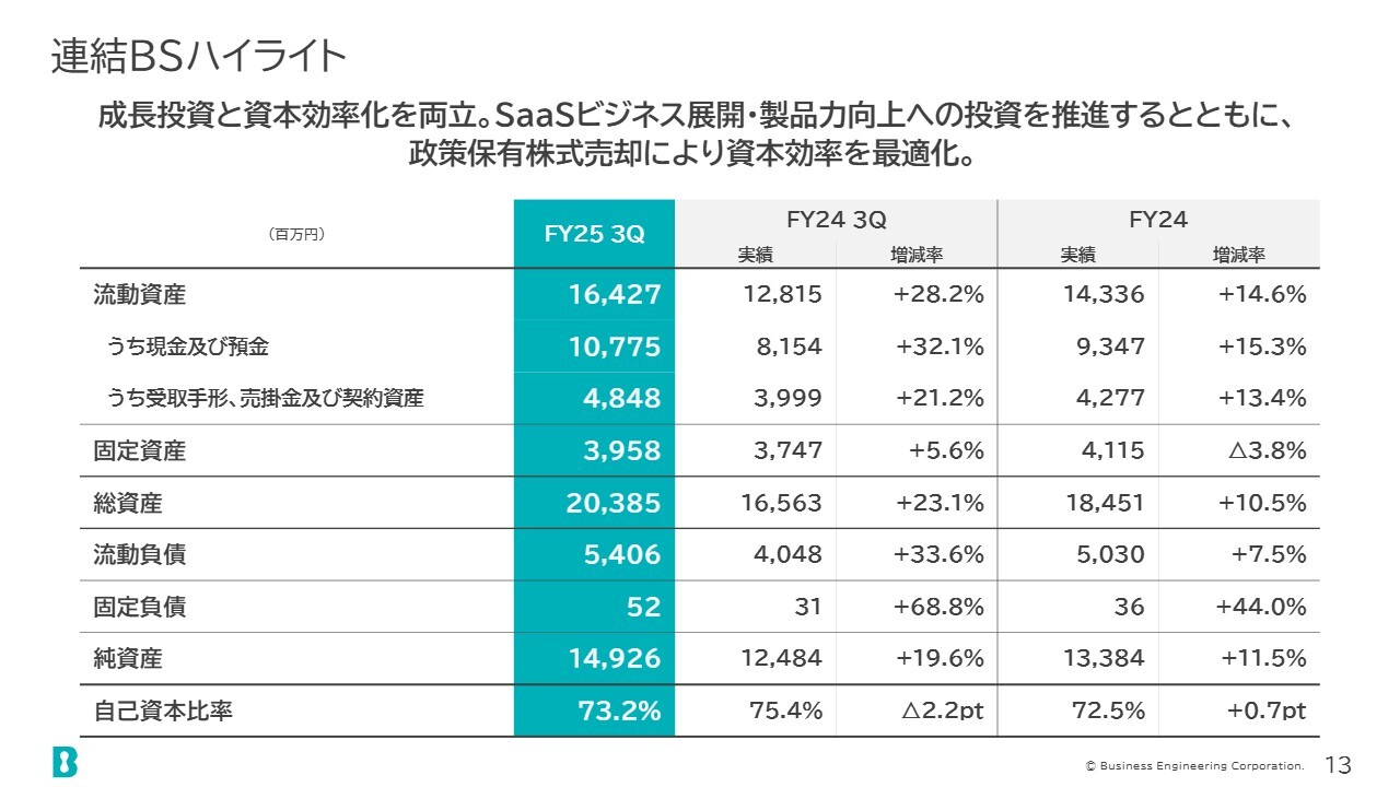 バランスシートについてです。第3四半期の総資産は約200億円、純資産は約150億円で、前期末に対して10パーセント強の増加となっています。