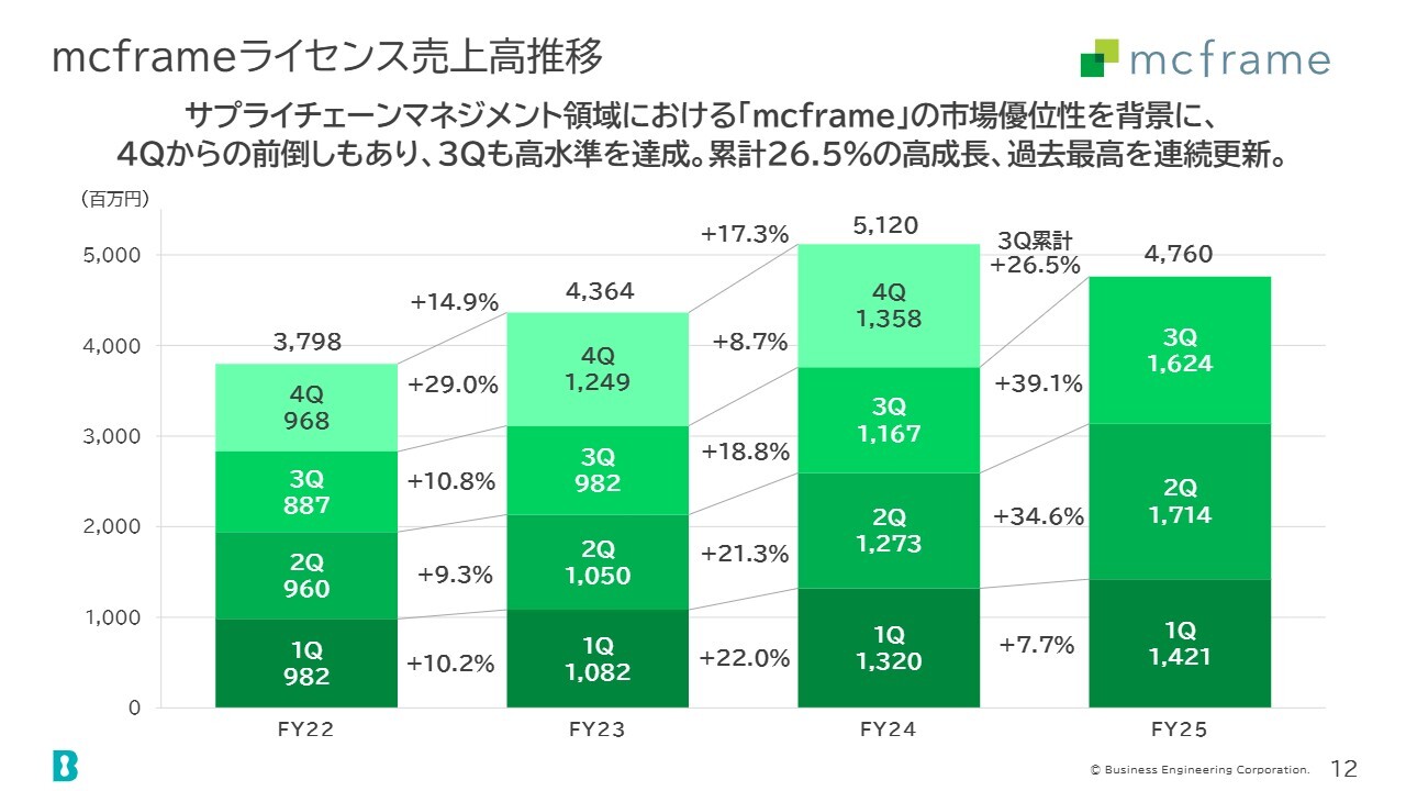 「mcframe」のライセンス売上高の推移です。第3四半期は第4四半期からの前倒しもあり、高水準を達成しました。売上高は16億2,400万円となっています。累計成長率は26.5パーセントと、かなり高い成長率を達成しています。