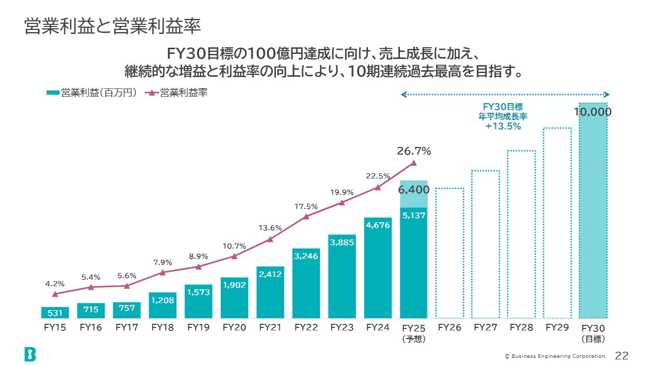営業利益の推移です。2030年度の100億円達成という目標に向けて、今年度は非常に良いスタートを切ることができました。