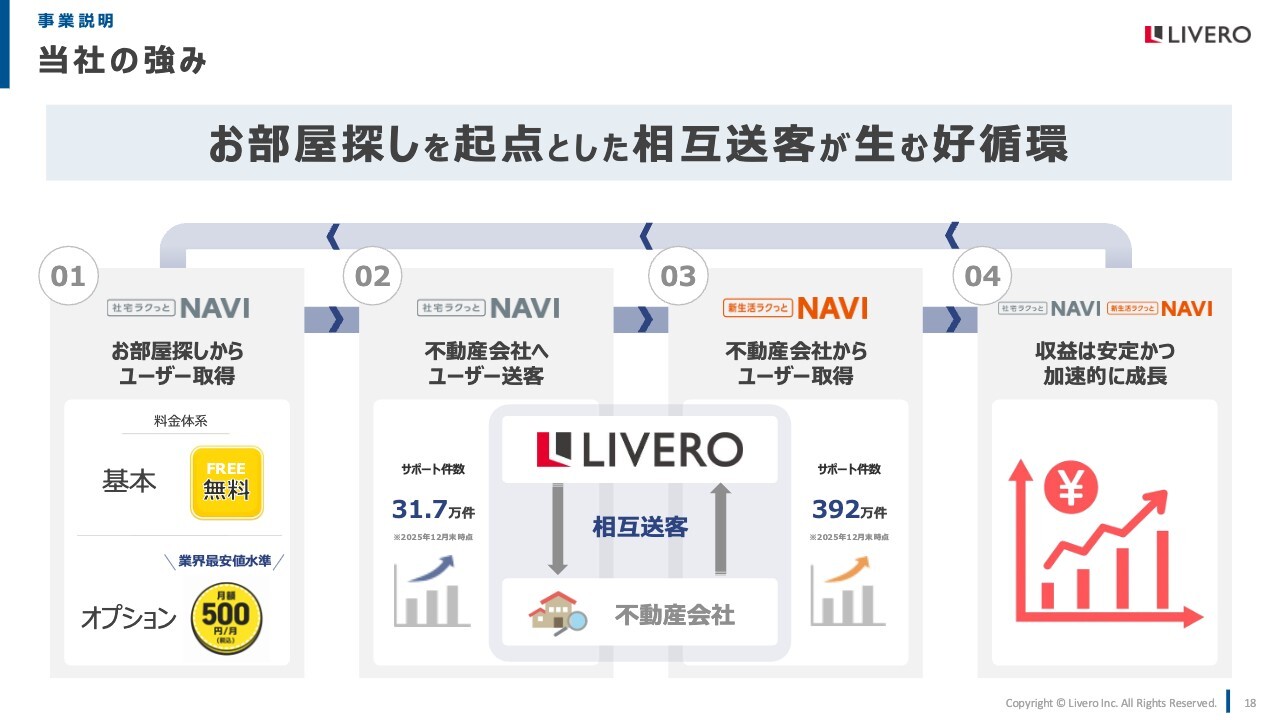 当社の強みはお部屋探しを起点とした相互送客が生む好循環構造であると考えています。当社は「社宅ラクっとNAVI」にてユーザー情報を集め、不動産会社さまへ送客をします。この送客数が増えることで、不動産会社さまからも「新生活ラクっとNAVI」にてより多くのユーザー情報をいただくことに繋がります。