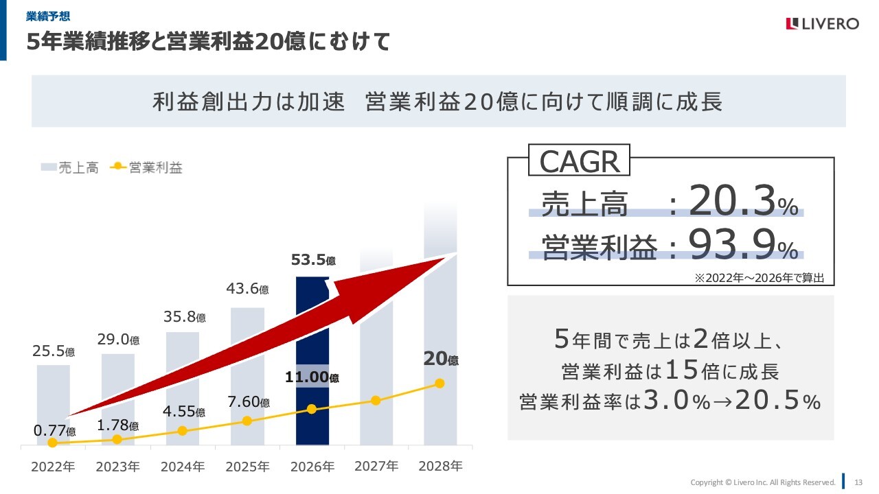 上場で獲得した資金をもとに、2022年に投資を行いました。その結果、営業利益は一時的に大きく減りましたが、そこから5年目となる今期までで、CAGRは売上高で20.3パーセント、営業利益で93.9パーセントと順調に伸ばすことができています。2028年の営業利益20億円を目指して、しっかりと計画を達成していきたいと思います。