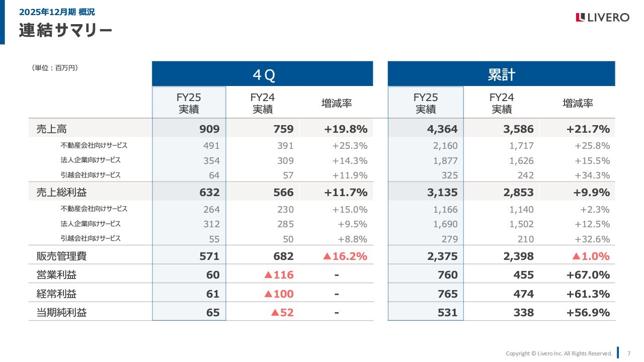 2025年12月期の第4四半期と累計の連結サマリーになります。これまでのご説明のとおり、売上高の成長を確保しながら、体制構築により販管費を改善することができました。