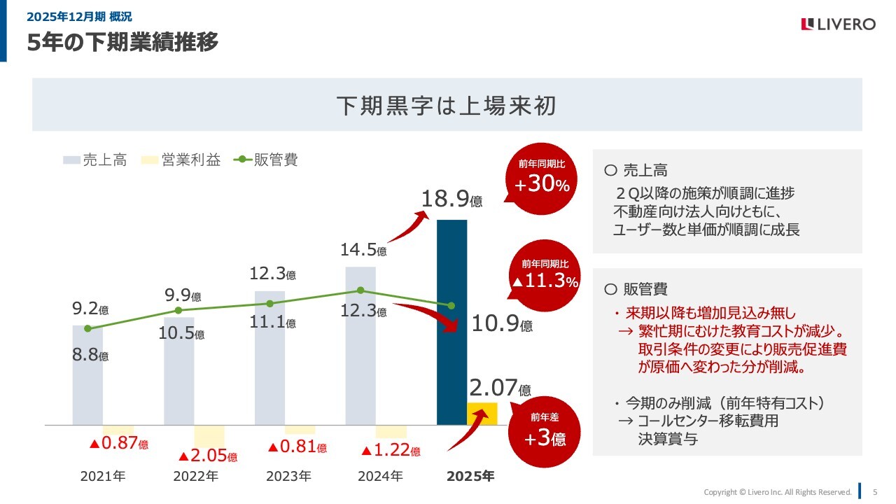 こちらは上場後の5年間の下期の業績推移となります。売上高の成長を継続しながらも、販管費を抑えることができるようになりました。特に、繁忙期に向けた人材教育に関するコストを抑える仕組みにできたことが大きな要因となっており、来期以降も同様の状況を作ることができると考えています。