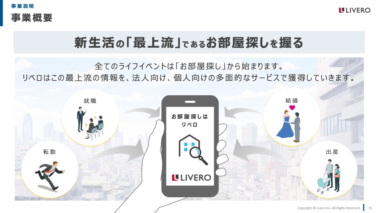 続いて、事業概要です。当社のサービスは新生活の「最上流」である、お部屋探しを握るところからスタートします。すべてのライフイベントは「お部屋探し」から始まり、リベロはこの最上流にある情報を、法人向け、個人向けの多面的なサービスで獲得しています。