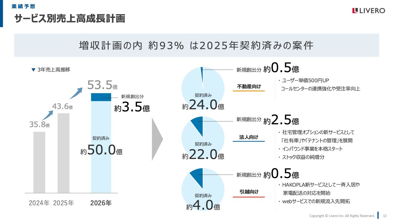 当社のビジネスモデル上、2026年の計画である売上高53.5億円に対して、50億円はすでに契約済のお客さまからのご依頼で達成できる予定となっています。そのため、予定どおりにご依頼をいただき、サポートを行うことで、約50億円分の収益は獲得できる状況にあります。各部門で2026年に新たに契約を獲得する計画は、ご覧のとおりとなっています。