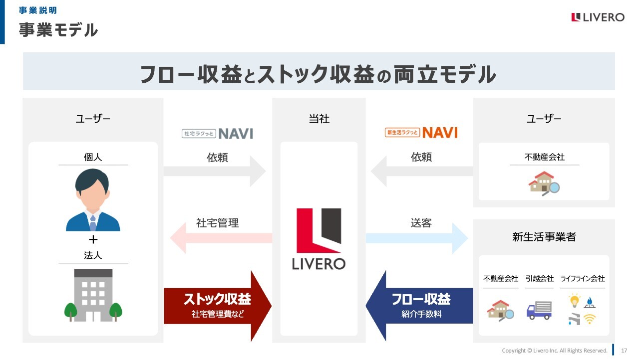 続いて、当社の事業モデルについてお話しします。ユーザーから「社宅ラクっとNAVI」「新生活ラクっとNAVI」を通じて、お部屋探しを起点とした転居者の情報が当社に集まります。集まった情報は、当社の提携する新生活関連事業者へ送客され、紹介手数料が得られます。これは当社のフロー収益となっています。