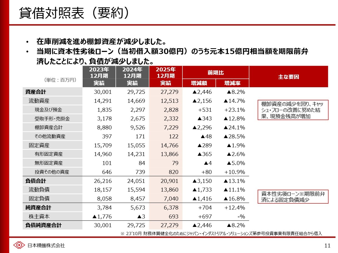 貸借対照表です。在庫削減に取り組んだ結果、棚卸資産が大きく減少し、現預金が増加しました。また、資本性劣後ローンの元本15億円相当額を期限前に弁済したことによる固定負債の減少を含め、負債合計額は前期比で30億円以上減少しています。