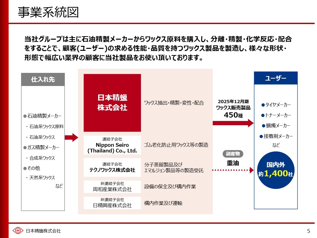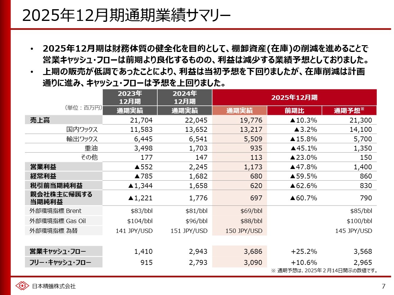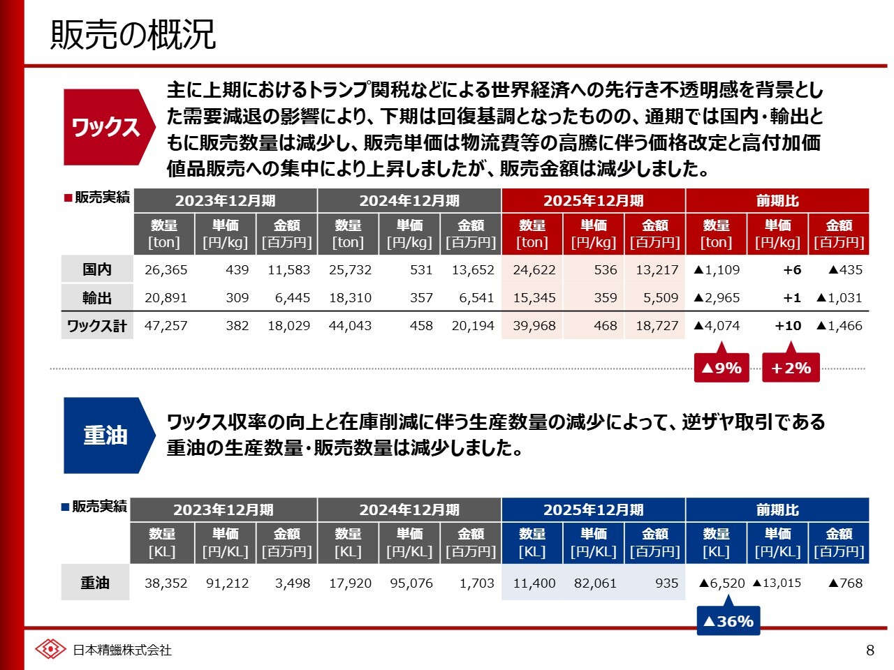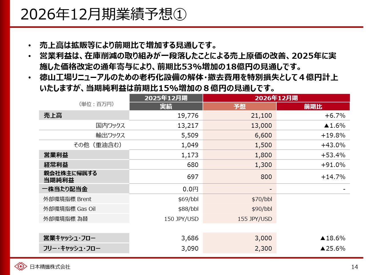 瀧本丈平氏:日本精蠟代表取締役社長の瀧本です。本日はお忙しい中ご視聴いただき、ありがとうございます。当社の2025年12月期の決算についてご説明します。