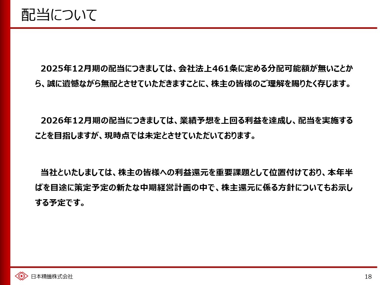 最後に、配当についてご説明します。前期は、会社法に定められている財務諸表上の配当金の支払いに充てられる金額、いわゆる分配可能額を確保するに至らなかったため、無配を継続せざるを得ませんでした。誠に申し訳ございません。