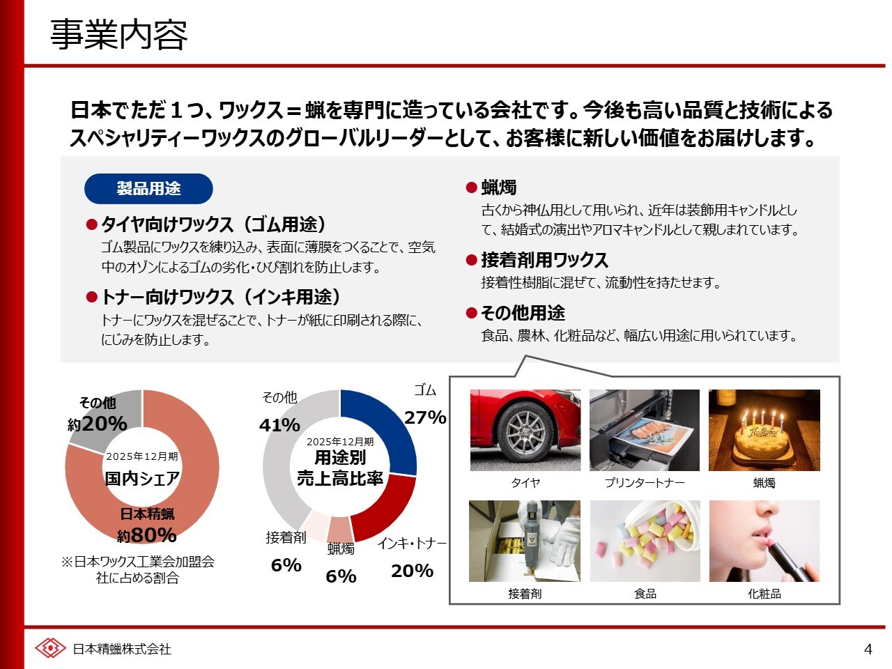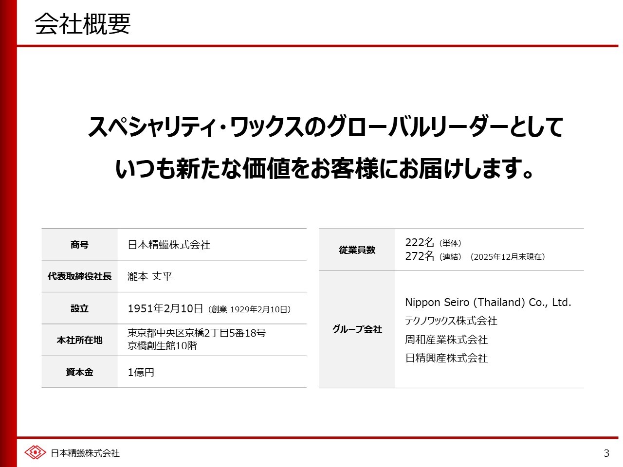 当社の概要についてです。当社は、スペシャリティ・ワックス事業をグローバルに展開し、お客さまに常に新しい価値をお届けし続けることを信条としています。