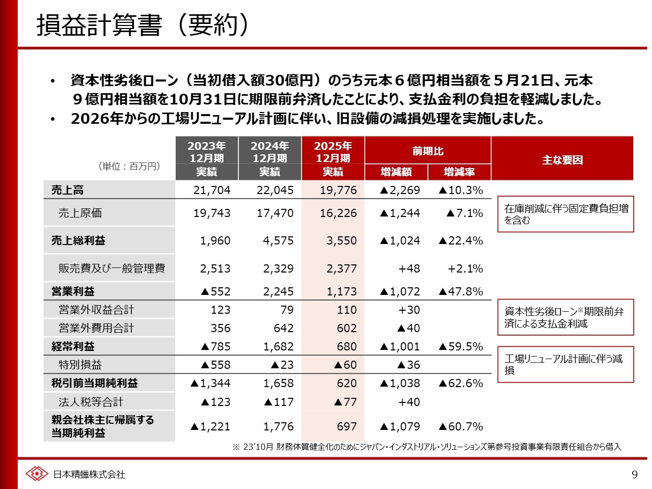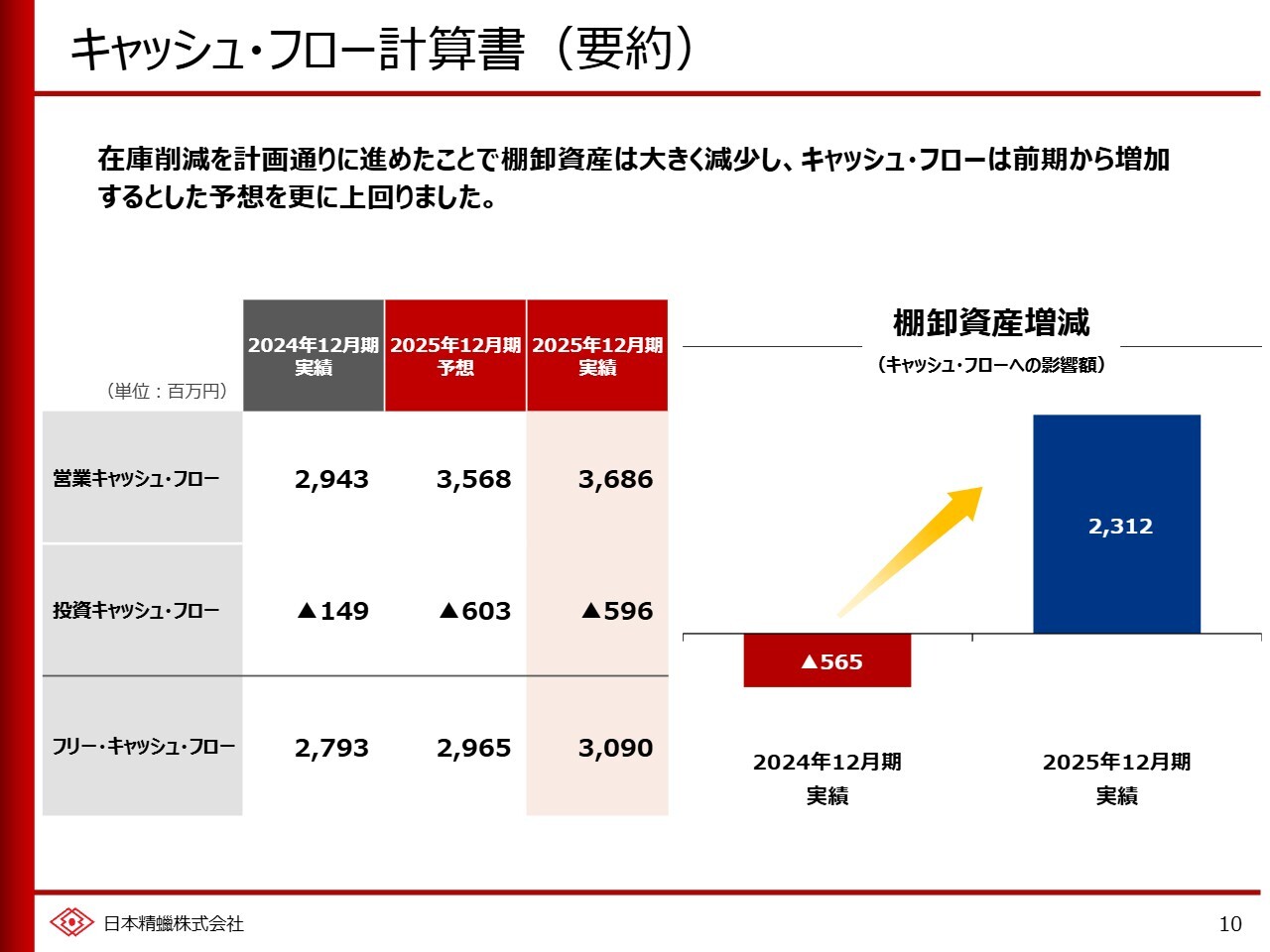 2025年12月期の業績についてご説明します。当期は在庫削減によって棚卸資産を減少させることでキャッシュ・フローを増加させ、財務体質を健全化させることに取り組みました。具体的には、販売数量より少ない量を生産することで在庫を削減しましたが、その結果、固定費負担が増加するため、利益は前期から減少する業績予想としていました。