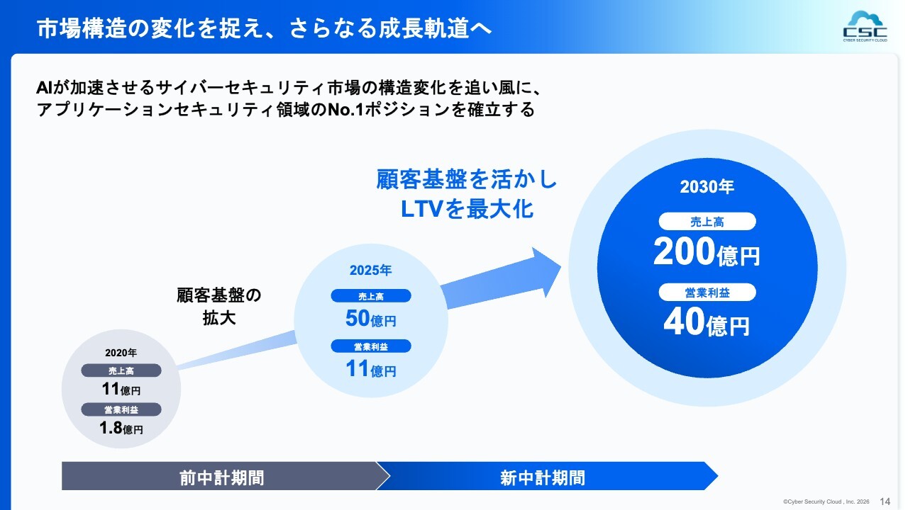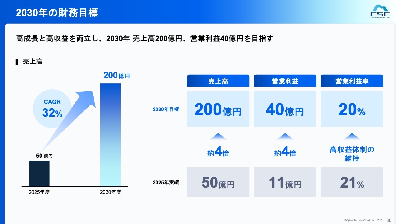 続いて、中期経営計画のご説明に移ります。まず財務面についてです。2030年度に売上高200億円、営業利益40億円を目指すことを、今回の新中期経営計画の大きなターゲットとしています。