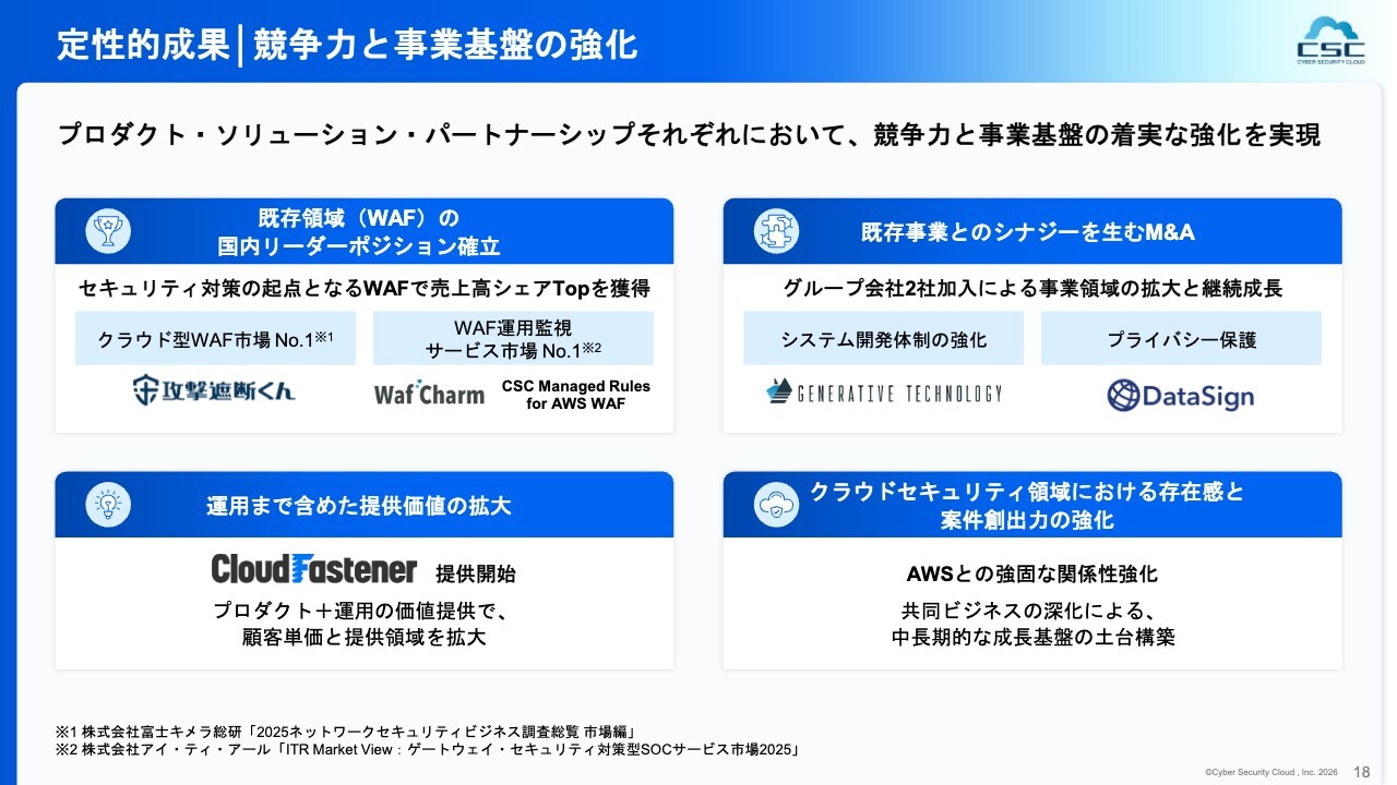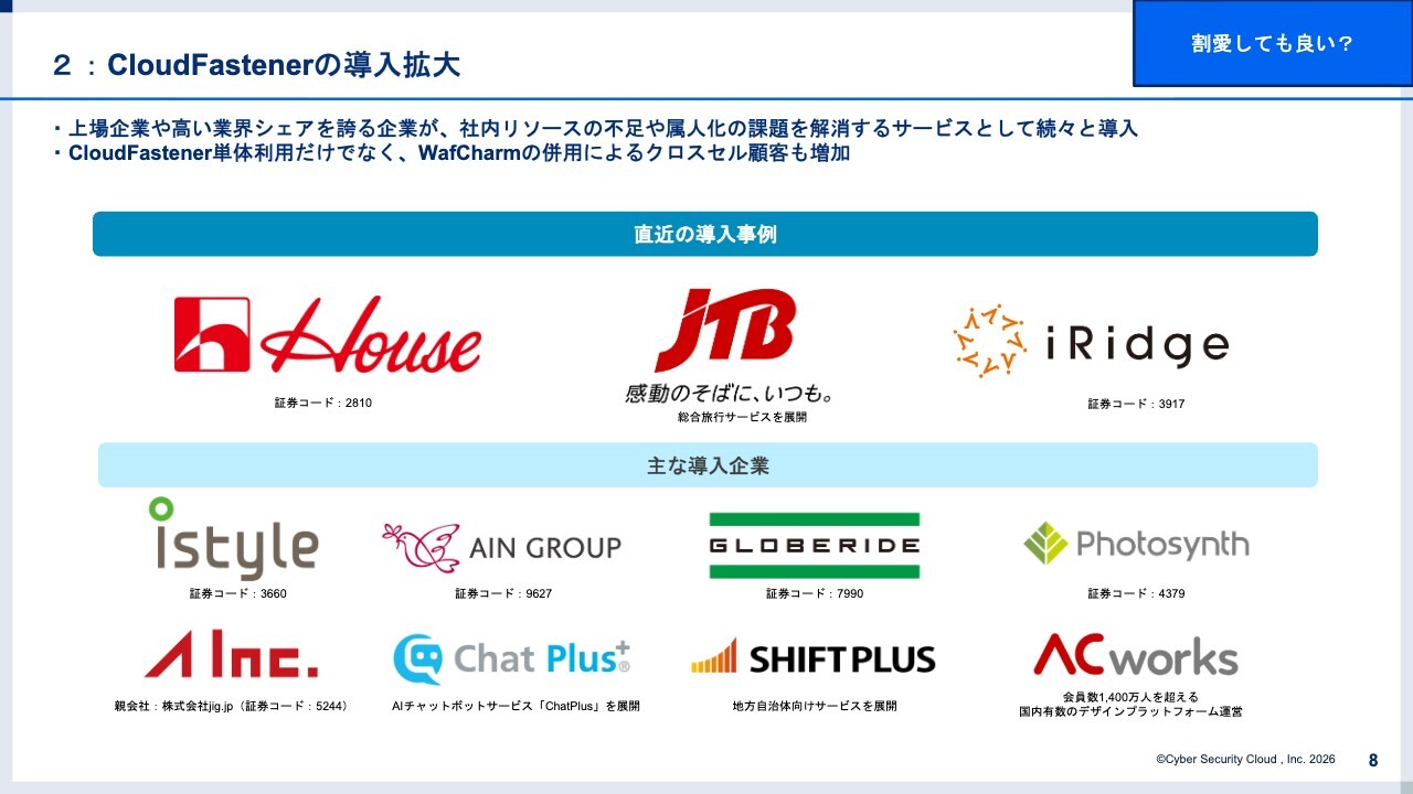また、「CloudFastener」単体でのご発注だけでなく、「WafCharm」との併用事例も増えてきています。後ほど新中期経営計画についてお話ししますが、「CloudFastener」の提供パターン、いわゆる勝ちパターンが、今後の当社の成長にとって非常に重要な兆しになってきていると言えます。