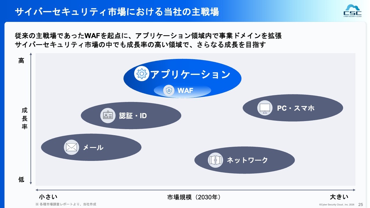 日本にはサイバーセキュリティ関連の上場企業が30社弱ありますが、その多くはアプリケーション以外の領域を対象としています。これらの領域では、例えばランサムウェア被害への対応など非常に高いニーズがありますが、当社は一貫してアプリケーション領域に注力し、WAFというアプリケーションの外壁のようなものを開発してきた実績があります。