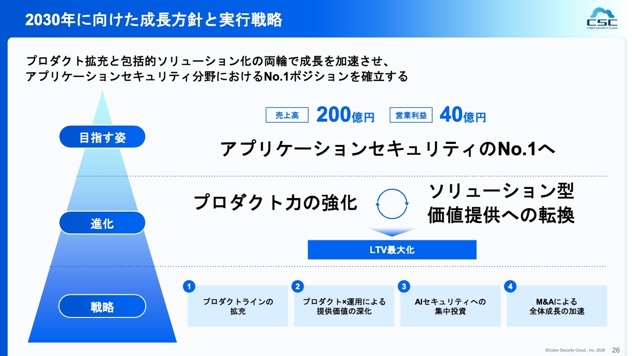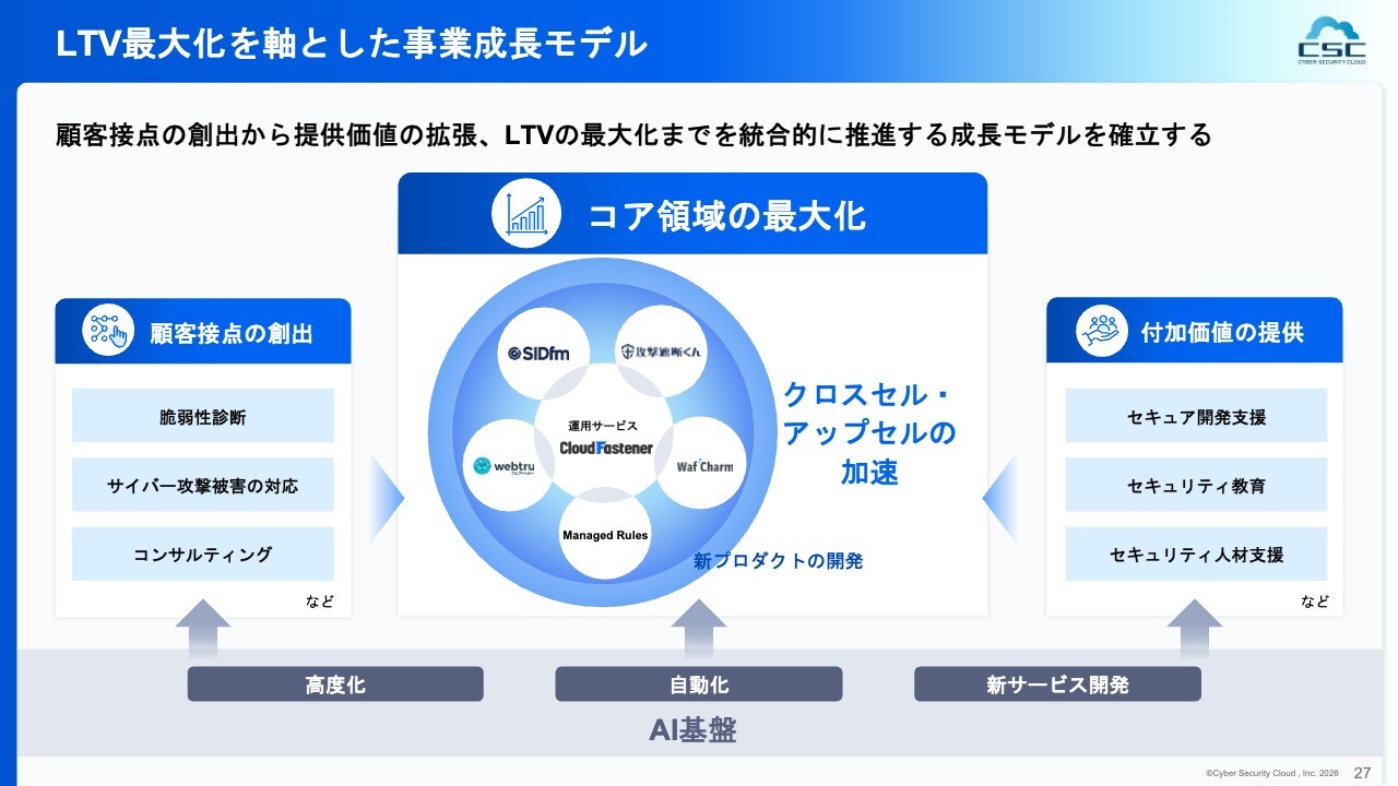 特にお客さまのさまざまな課題に対応し、安心して利用いただける商品を開発することに注力していますが、ビジネス目線、投資家のみなさまへの説明という観点では、私たちの製品を長期間、幅広く活用してもらうことが重要だと考えています。その結果としてLTVを伸ばしていくことを目指し、この点に重きを置いて今後のビジネスを構築していく方針です。