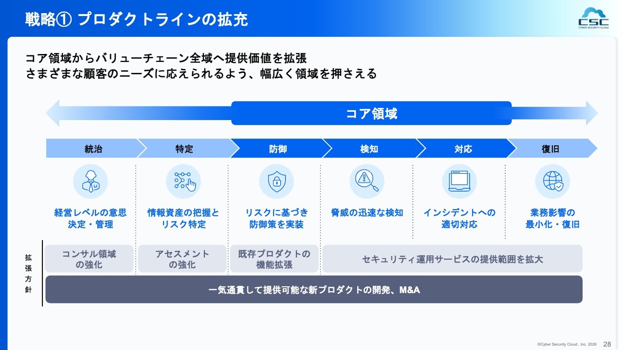 これらのソフトウェアや一部サービスを含む既存の製品に加え、新たなプロダクトも引き続き開発していきます。そして、中央のコア領域の売上を最大化すること、または単体でも売上を最大化することを1つの軸として掲げています。