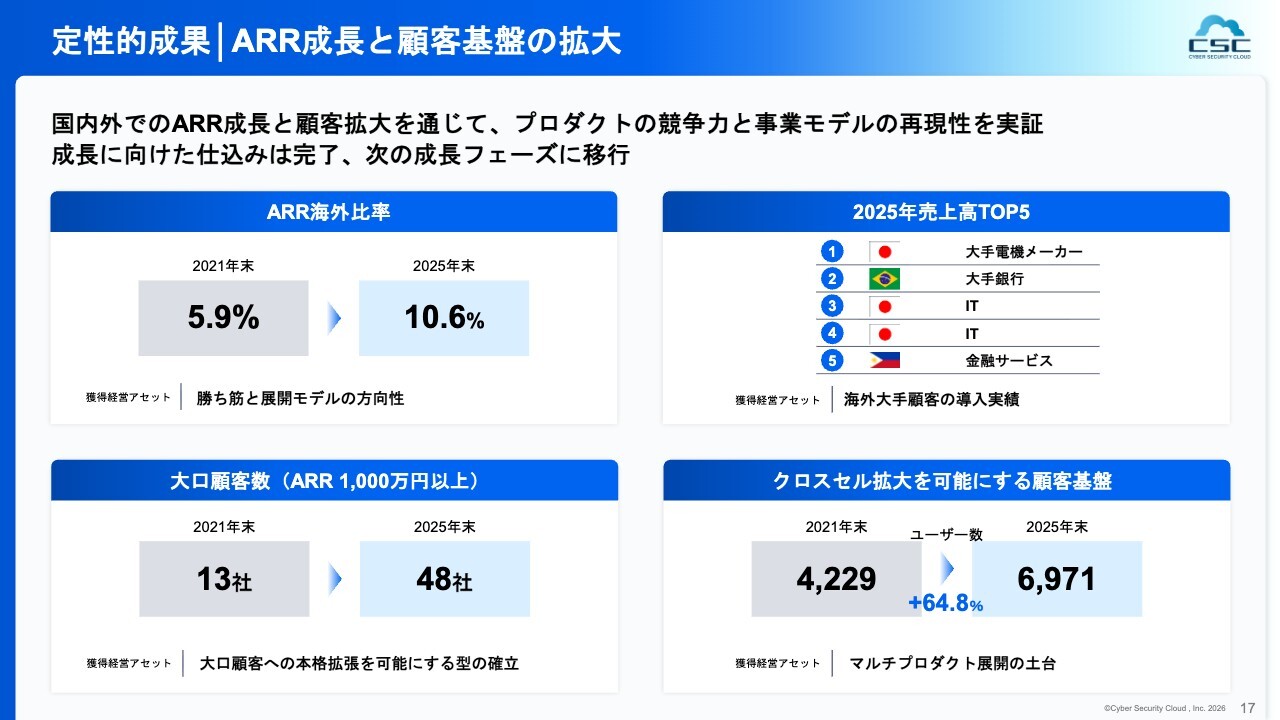 また、この中期経営計画期間におけるトピックとしては、先ほどお伝えしたARR海外比率の上昇に加え、スライド右上に記載されているように、売上高が大きい順で並べた際にトップ5に日本以外の顧客が2社含まれるようになったことも非常に重要なトピックだと考えています。