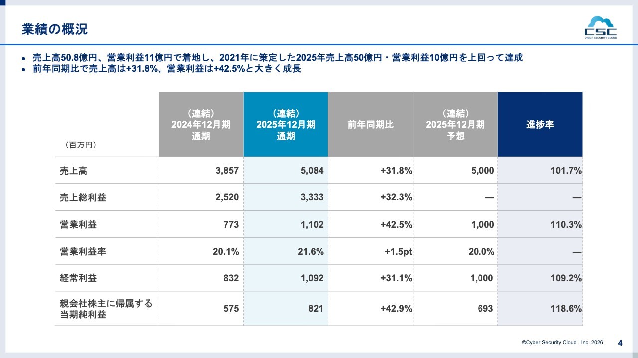 2025年12月期の業績予想として、売上高50億円、営業利益10億円を通期の目標および前中期経営計画の最終目標として公表していましたが、いずれも上回る結果を達成しました。