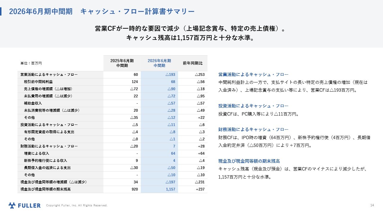 キャッシュ・フロー計算書についてご説明します。営業キャッシュ・フローはマイナス1億9,300万円となっています。中間純利益を計上した一方で、現在は入金済みとなっている支払サイトの長い特定の売上債権が増加したことや、7月に上場記念賞与の支払いがあったことなど、一時的な要因によるものです。