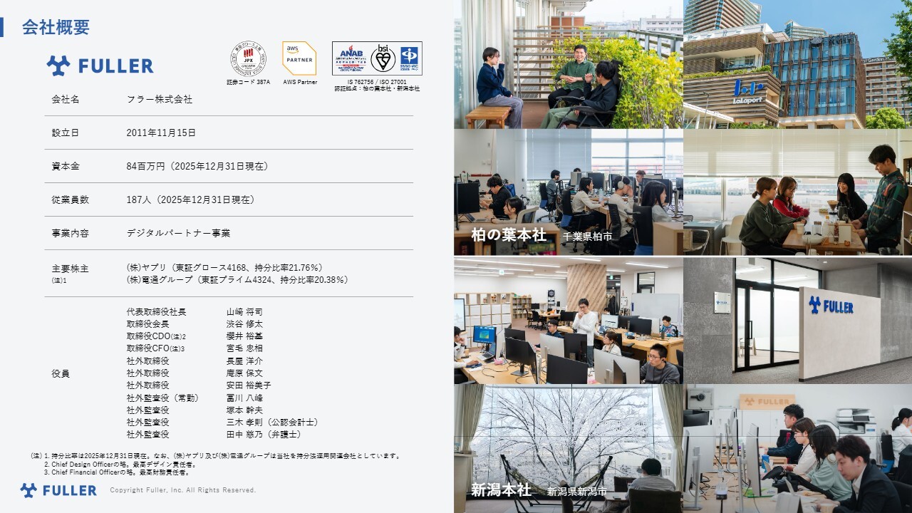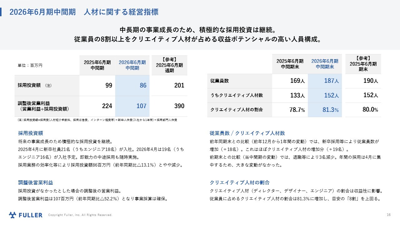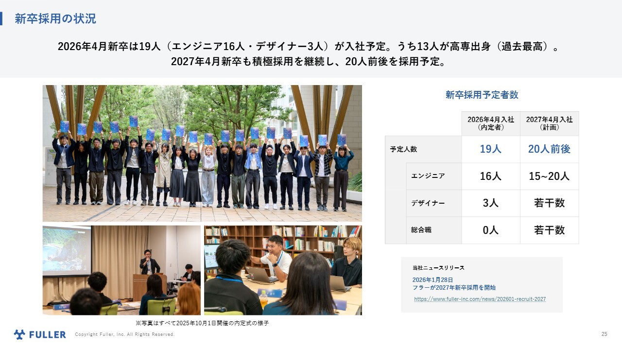 2027年4月の新卒採用活動もすでに始まっており、引き続き20名前後の採用を予定しています。中期的に当社の人材を厚くするためにも、新卒の方を採用し、育成することがフラーの事業において非常に重要な基盤であると考えています。