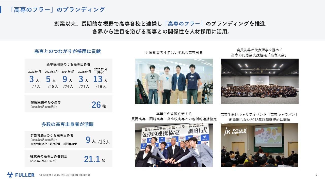 全国の高専との連携についてお話しします。フラーは、会長の渋谷を含めた共同創業者4人が全員高専出身です。創業以来、長期的な視野で全国の高専との連携を強めており、「高専のフラー」として認知されています。これは、長期的な採用に大きく貢献しています。以上が簡単な会社概要です。