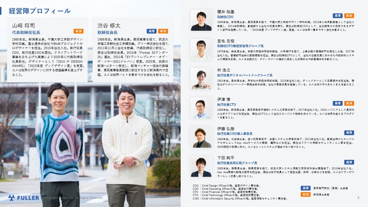 経営陣の大きな特徴として、8名中5名が高専卒であり、さらに4名が新潟県出身です。