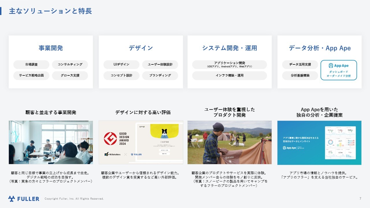 スライドの一番右側に、自社サービスであるアプリ分析サービス「App Ape」を示しています。これはフラーが創業当初から手がけてきたものです。「App Ape」では競合アプリや市場トレンドを分析することができ、顧客のアプリ戦略策定を支援しています。