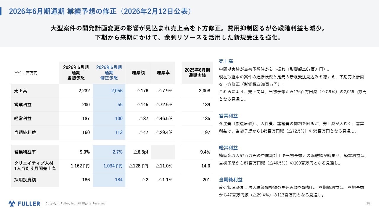 今期は、上期の売上が当初の計画を下回りました。本来はこの下振れを下期で取り返す見込みでしたが、大型案件の開発計画変更が1月以降に判明したことの影響を踏まえ、業績予想を下方修正しました。
