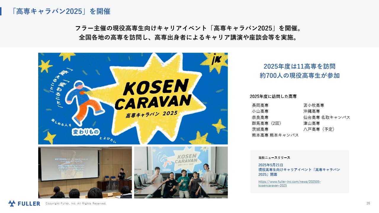 最後のトピックとして、「高専キャラバン2025」についてお伝えします。毎年フラーが主催となり、現役高専生向けにキャリア講演や座談会を実施しています。これは創業間もない頃から取り組んでいます。2025年度は11高専を訪問し、約700人以上の現役高専生に参加していただきました。