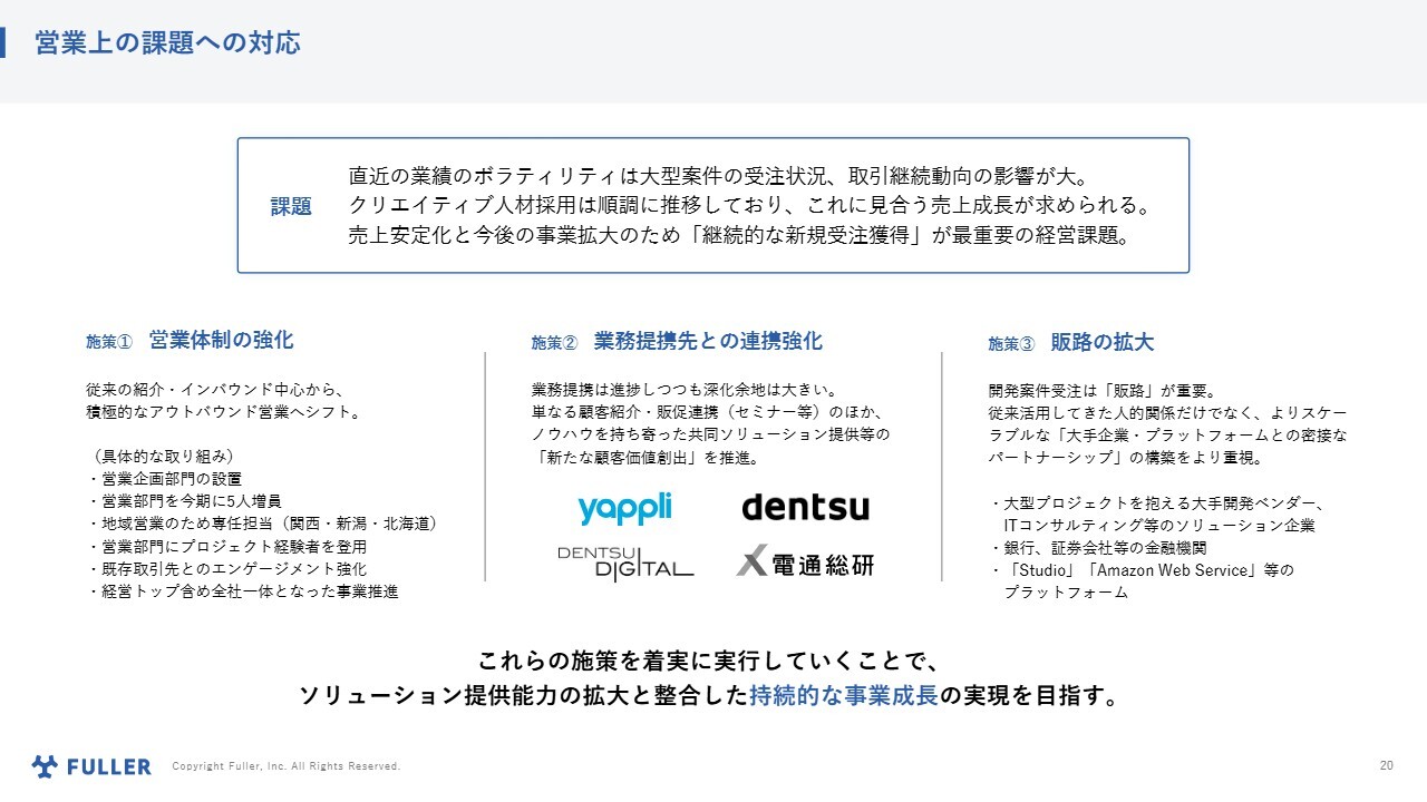 営業上の課題については、直近の業績のボラティリティが大型案件の受注状況や取引継続動向に大きく左右されたことが影響しています。人材採用は順調に推移しており、これに見合う売上成長が非常に求められています。