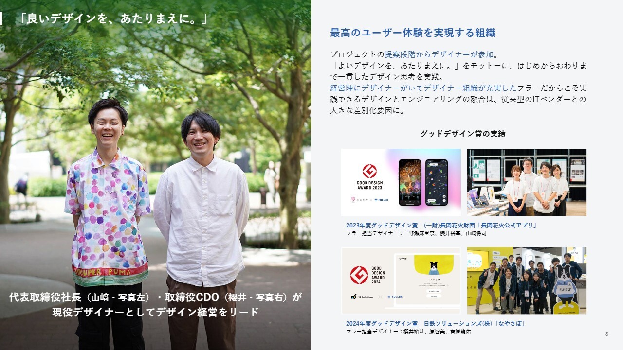 フラーはデザインに注力しており、このデザイン力が他社との大きな差別化要因となっています。社内にデザインの考え方を浸透させており、すべてのプロジェクトの提案段階からデザイナーが参加しています。