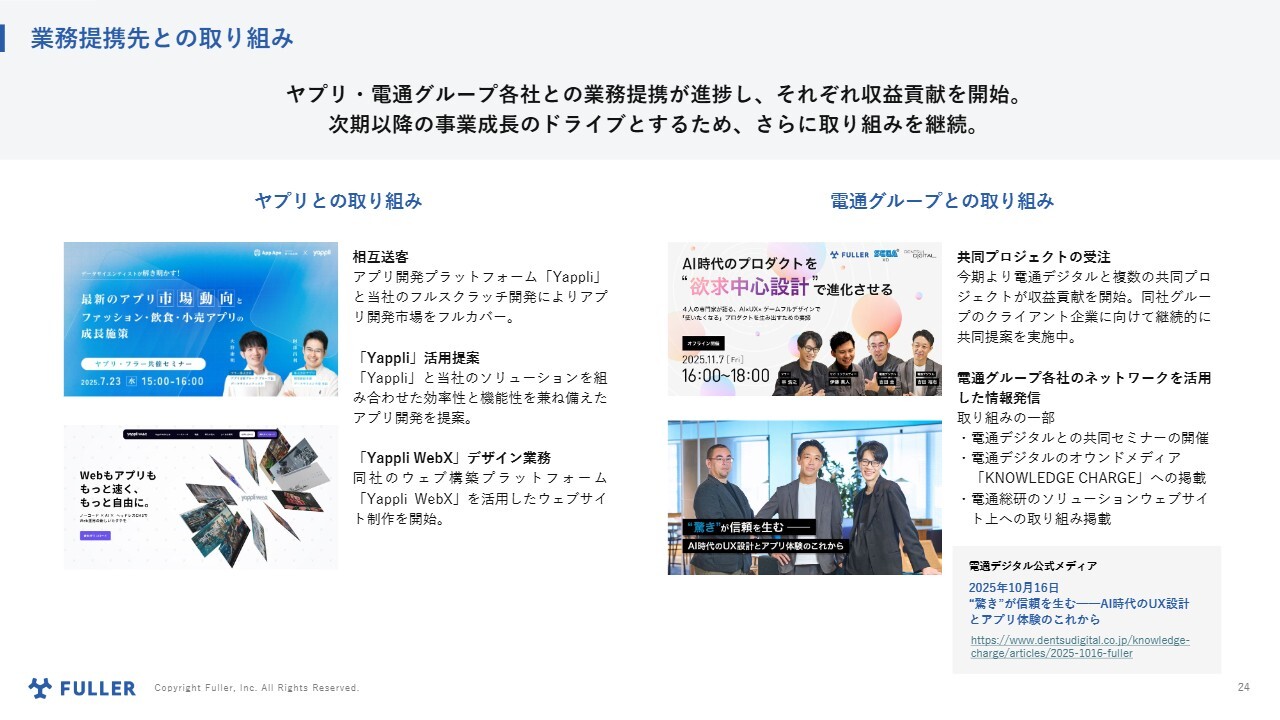 一方、株主であるヤプリおよび電通グループ各社との資本業務提携の結果、今期より販売提携が収益に寄与し始めました。今後の売上成長に向け、両社との取り組みを非常に重視しています。