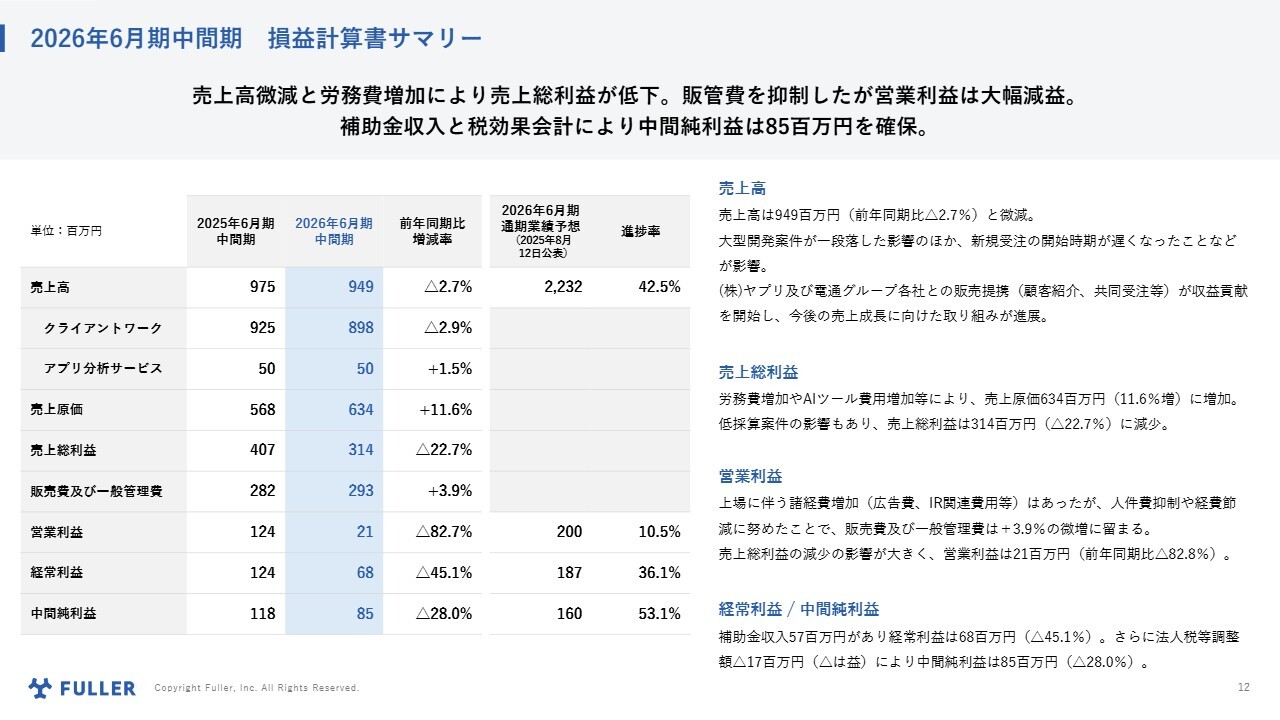 中間純利益は補助金収入と税効果を含めて8,500万円となり、前年同期比で28パーセント減少しました。