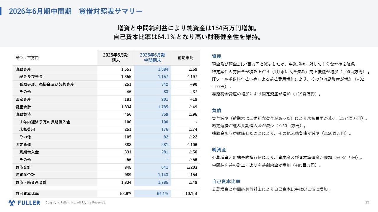 貸借対照表についてご説明します。この中間期において上場がありました。その結果、IPOに伴う増資と新株予約権の行使、および中間純利益の計上により、純資産は1億5,400万円増加しました。自己資本比率は64.1パーセントと、引き続き高い財務の健全性を維持しています。