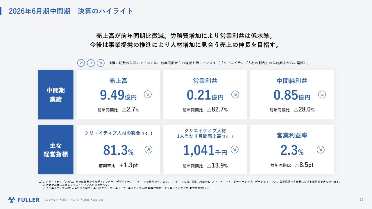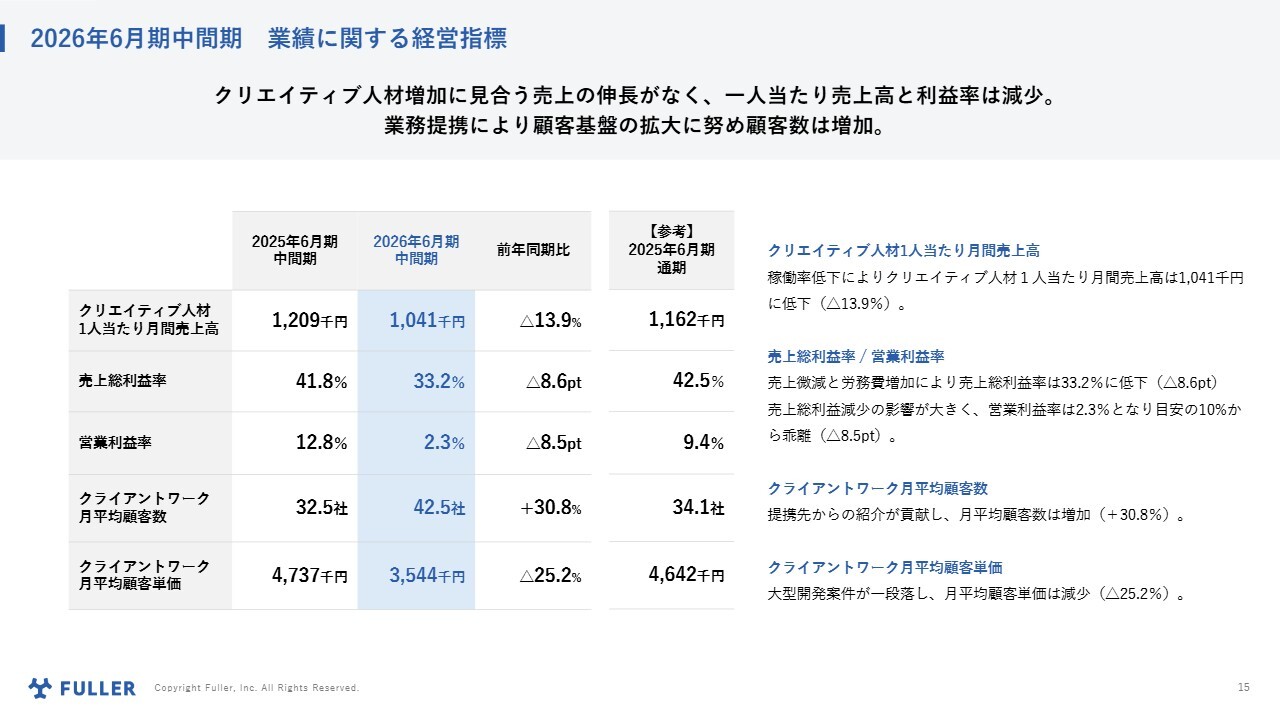 一方で、クリエイティブ人材1人当たりの月間売上高は、人材獲得にもかかわらず売上が増加しなかったため104万1,000円となり、前年同期比で13.9パーセント減少しました。