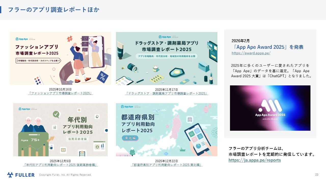 そのほかに「ワークマン公式アプリ」や「ジハンピ」など、さまざまな魅力的なアプリをご紹介していますので、ぜひご覧いただければと思います。フラーの分析チームでは、市場調査レポートや「App Ape Award」などを定期的に発信していますので、ぜひご覧ください。