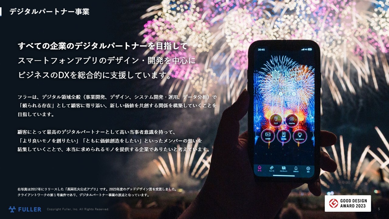 フラーが展開するデジタルパートナー事業は、スマートフォンアプリのデザインや開発を中心に、顧客のビジネスDXを総合的に支援するものです。スライドの写真は、事業の原点である「長岡花火公式アプリ」で、2017年から取り組みを続け、現在まで8年以上にわたって改善を重ねています。