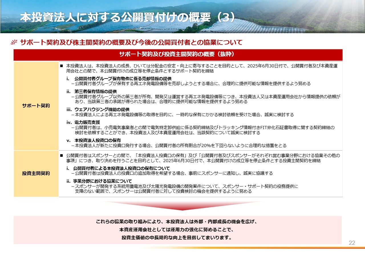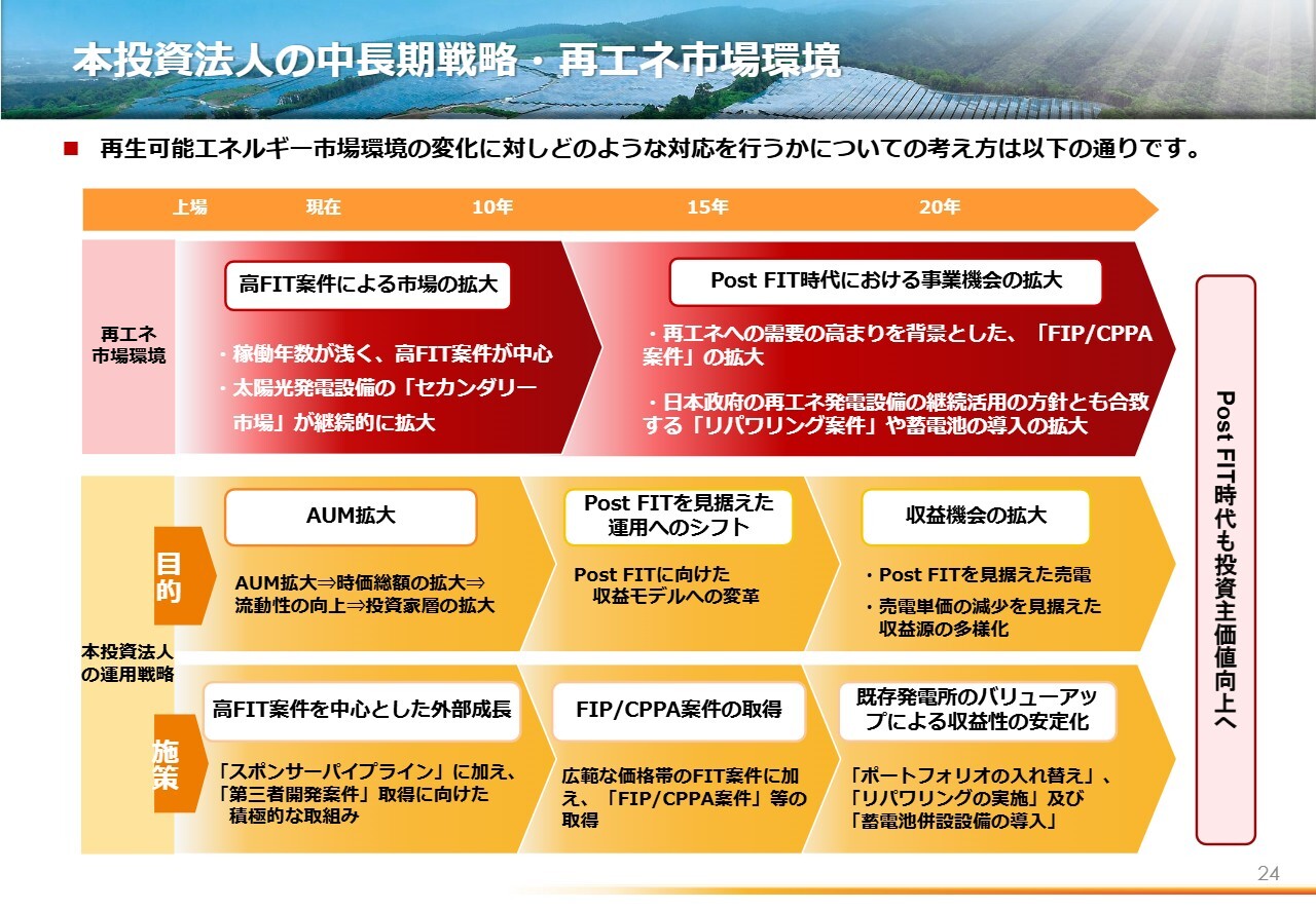 内部成長については、「Post-FIT」を見据え、収益モデルの変革に取り組みます。具体的には、ポートフォリオの入れ替え、リパワリングの実施、蓄電池併設設備の導入、FIP転換などを通じて、FIT期間終了後も安定した収益を持続できる体制を構築します。また、コーポレートPPA市場の拡大を見据え、「FIP+コーポレートPPA」案件の取得や、既存案件のコーポレートPPA化に向けた体制整備も推進します。