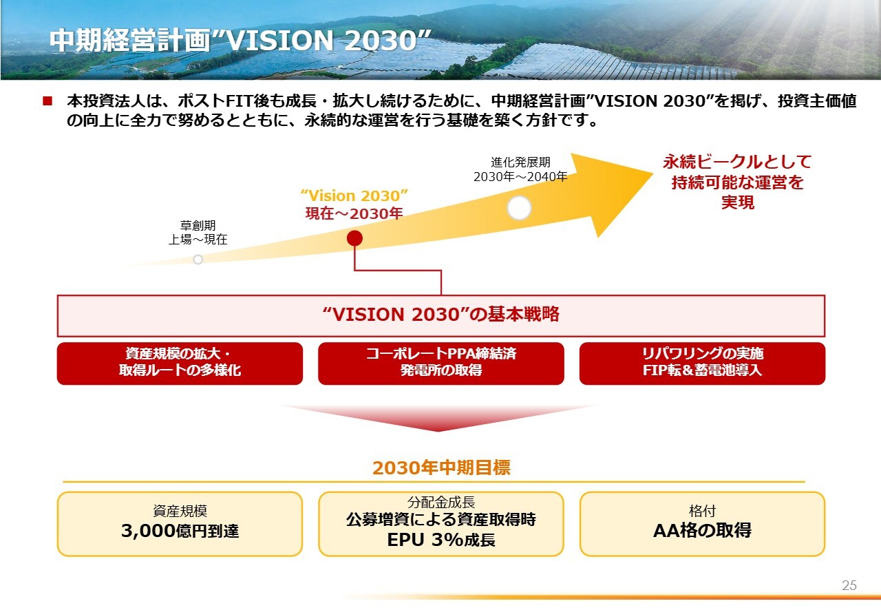 本投資法人では、「Post-FIT時代」における継続的な成長・拡大を目的として、中期経営計画「VISION 2030」を策定しています。この計画は、2030年という1つの中間地点を見据え、投資主価値の向上を目指した取組みを体系的に進めていくものです。外部成長と内部成長の両輪を同時に活用することで、成長を継続させていきます。